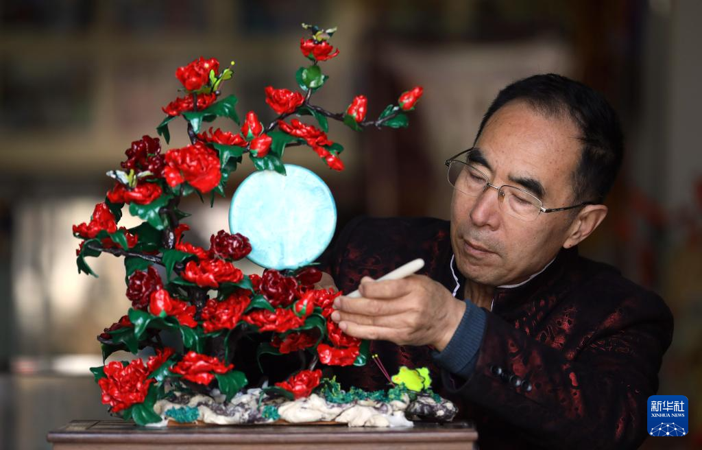 3月13日,陈群厚在营口辽河老街的工作室内修整面塑作品《花好月圆》。