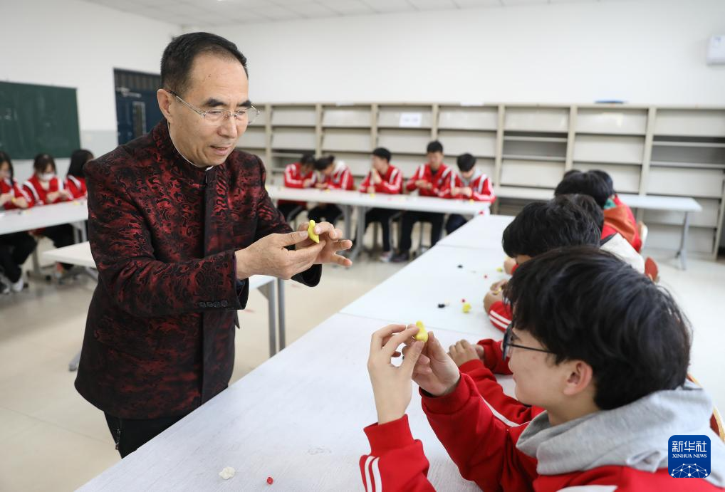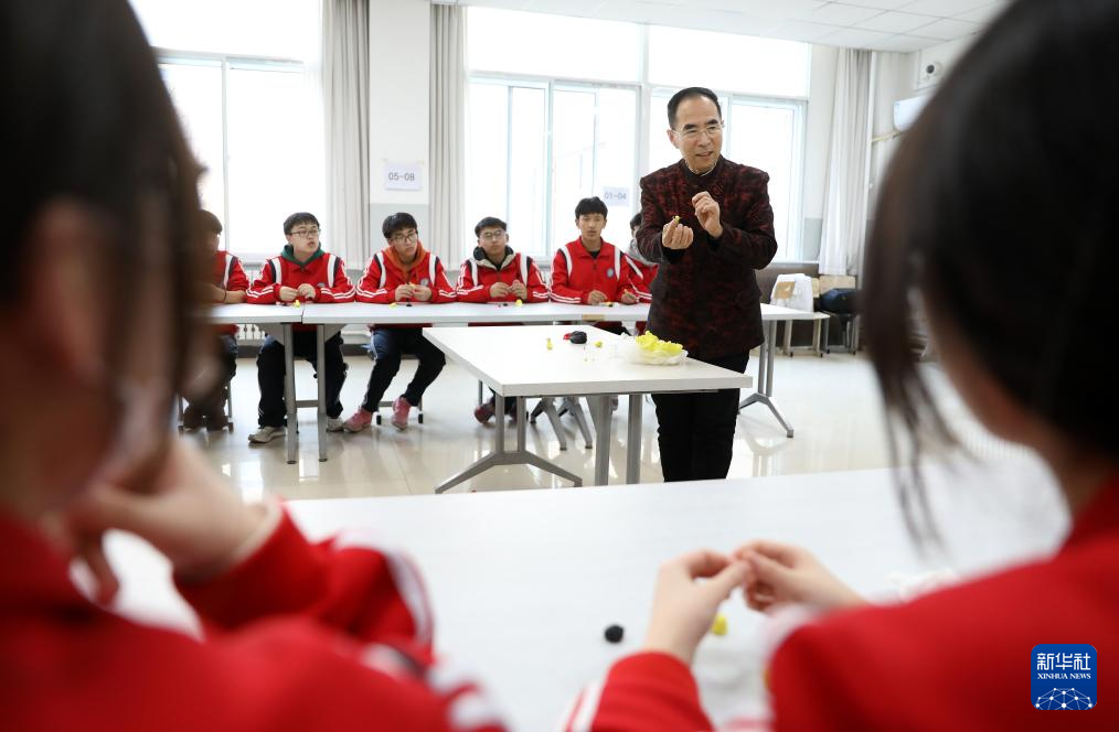 3月13日,陈群厚在营口市第二高级中学为学生讲解面塑技艺。
