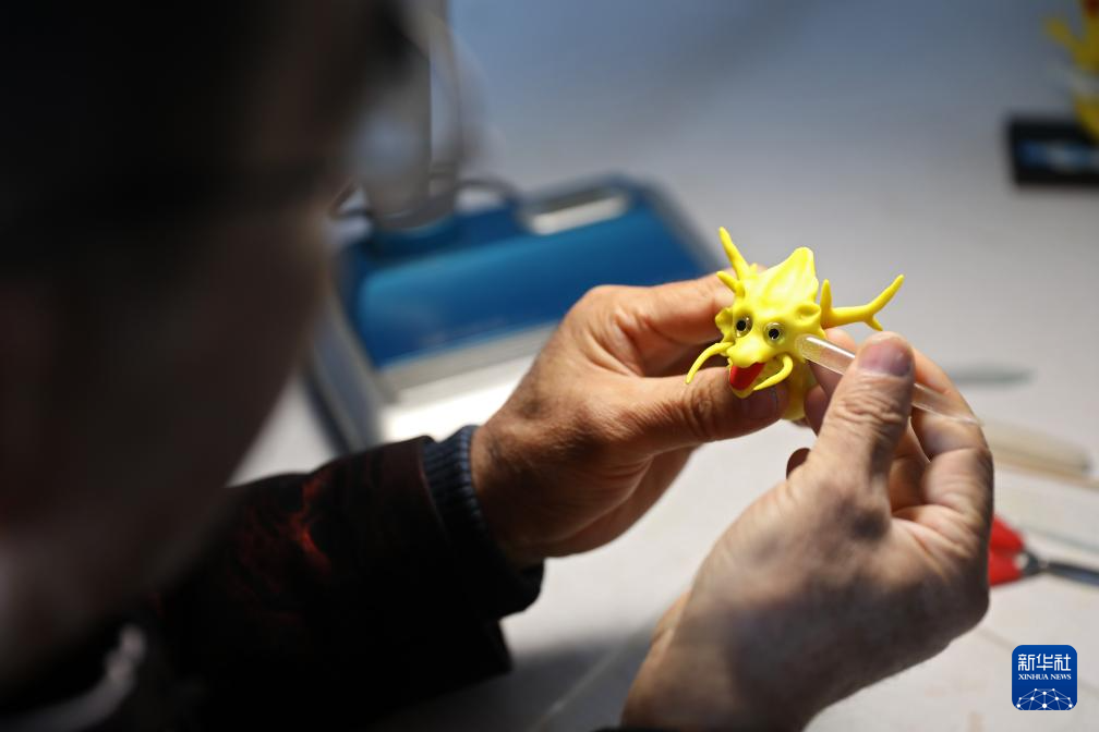3月13日,陈群厚在营口辽河老街的工作室内制作生肖龙面塑。