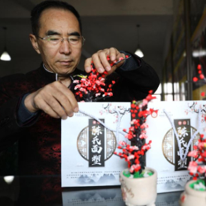 3月13日,陈群厚在营口辽河老街的工作室内将面塑成品放入包装袋内。