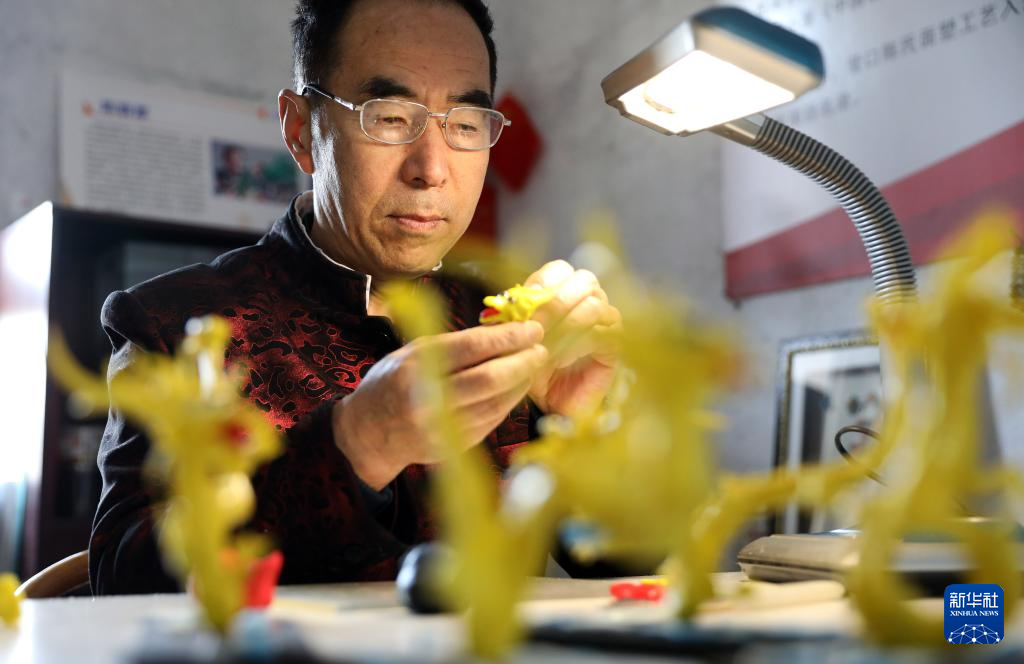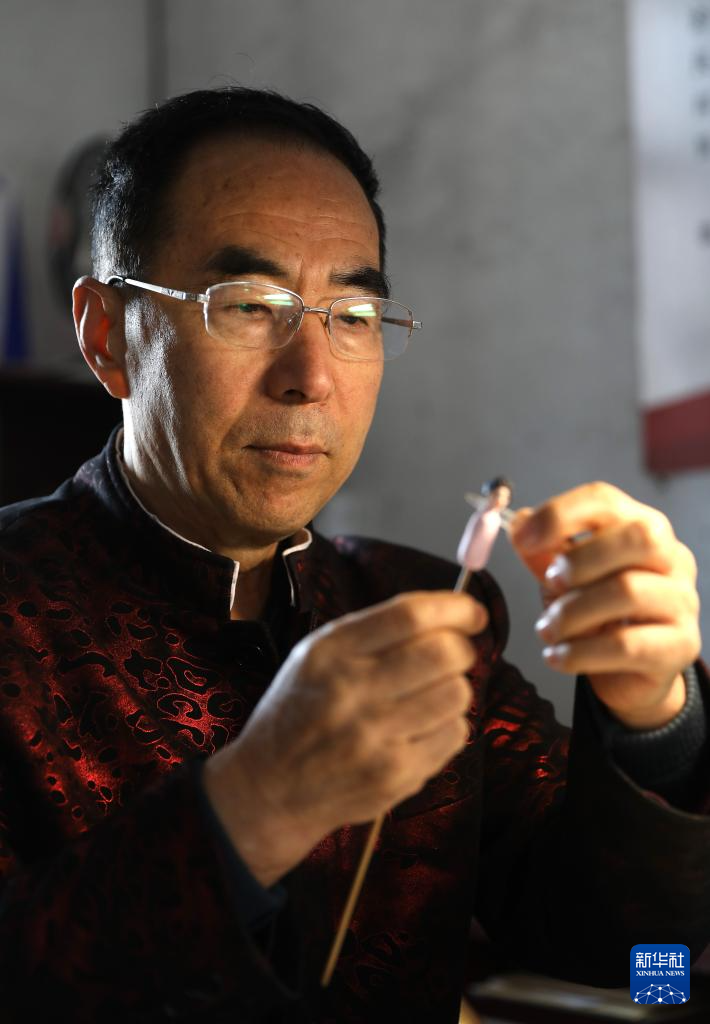 3月13日,陈群厚在营口辽河老街的工作室内制作面塑作品。