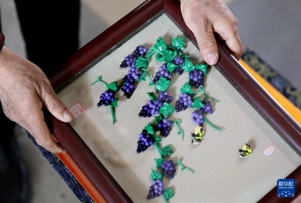 3月13日,陈群厚在营口辽河老街的工作室内将装裱好的面塑作品《硕果累累》放入包装盒内。