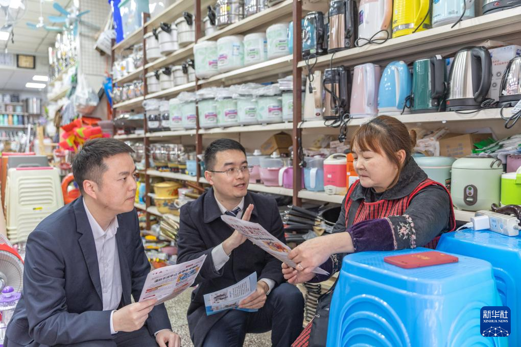 3月14日,华夏银行江北支行的金融网格员詹拓(左)、陈平(中)在观音桥建东综合市场为个体工商户宣讲金融反诈知识。
