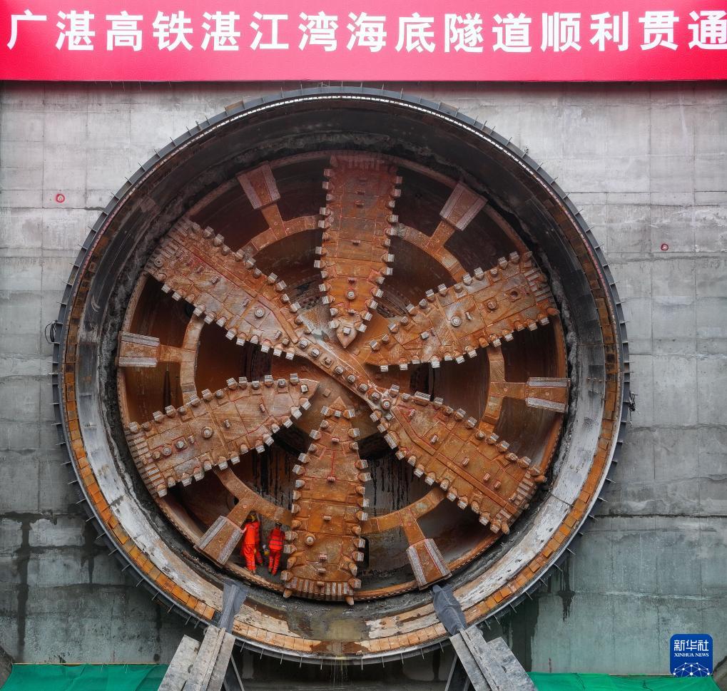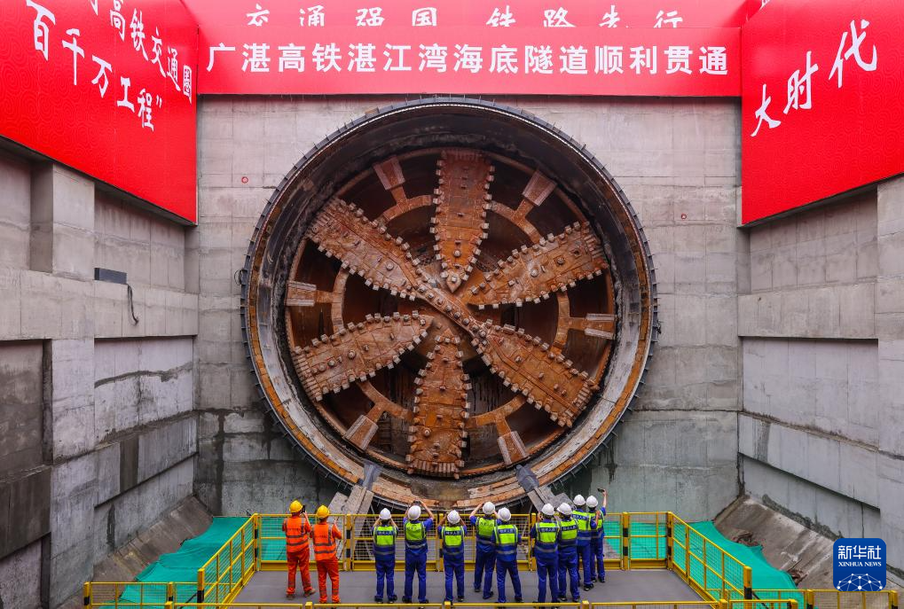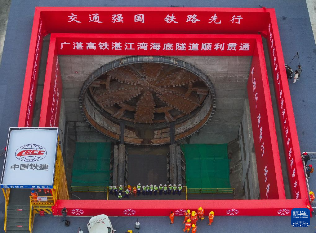 3月15日,建设者在广湛高铁湛江湾海底隧道盾构接收井见证隧道贯通。