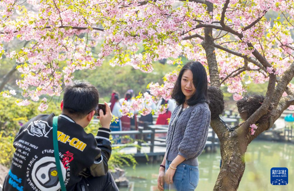 3月16日,游人在广西南宁市青秀山景区的樱花园赏花踏春。