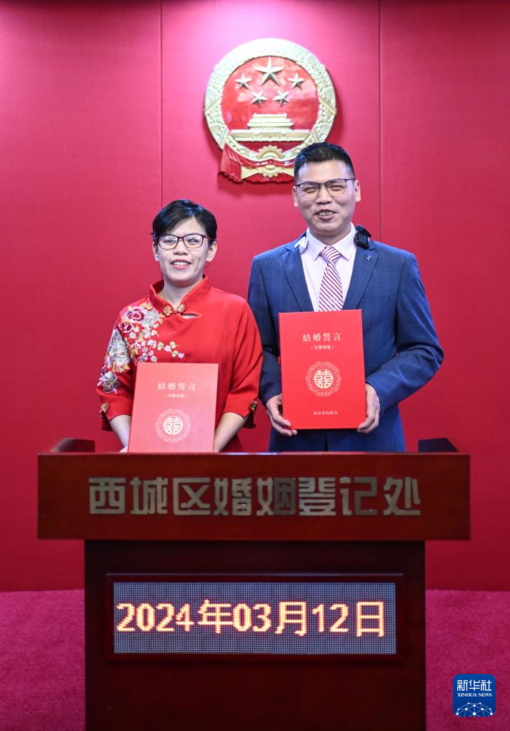 当日,北京市西城区婚姻登记服务中心宣誓厅里,新人张女士和王先生手捧结婚誓言,共同许下携手一生、白首不离的诺言。