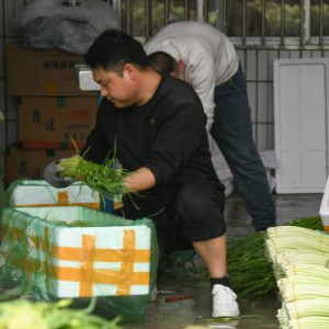 3月16日,在郫都区德源街道东林村一处收购点,村民将蒜薹整理装箱,准备运往外省。
