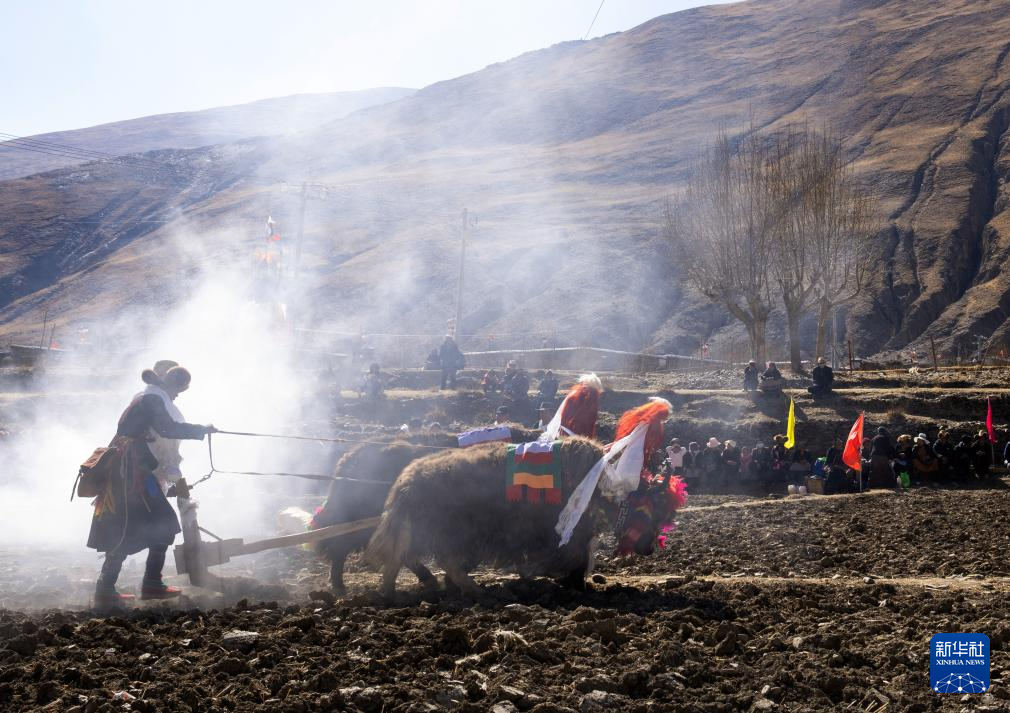 3月16日,在西藏山南市琼结县加麻乡加麻村的春耕仪式现场上,农民沿袭传统,使用二牛抬杠翻土犁地。