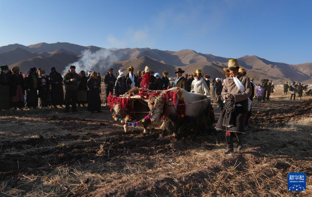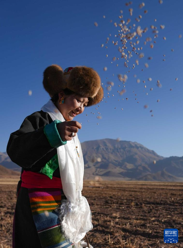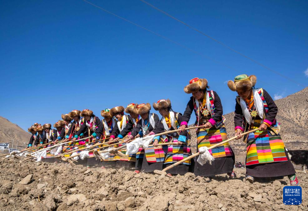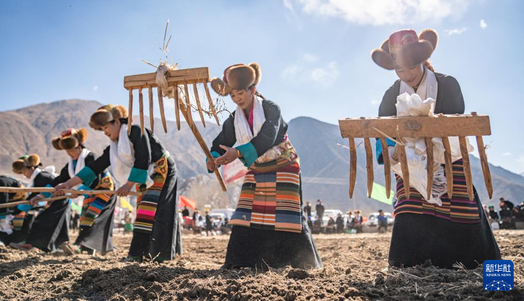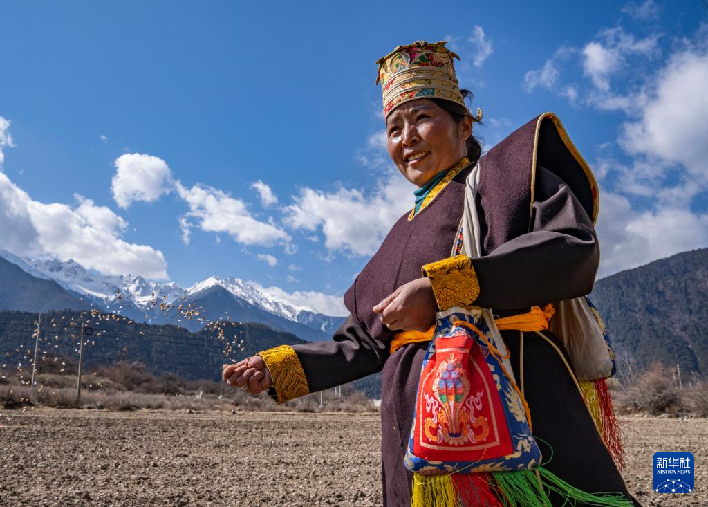 当日是西藏农民举行一年一度春耕大典的日子。村民沿袭着传承千年的春耕民俗,身着节日盛装,手捧“切玛”(五谷丰登斗),唱起祈愿歌,互敬青稞酒。当铁犁翻开土地,妇女将手中的种子撒下,祈求新的一年丰收。