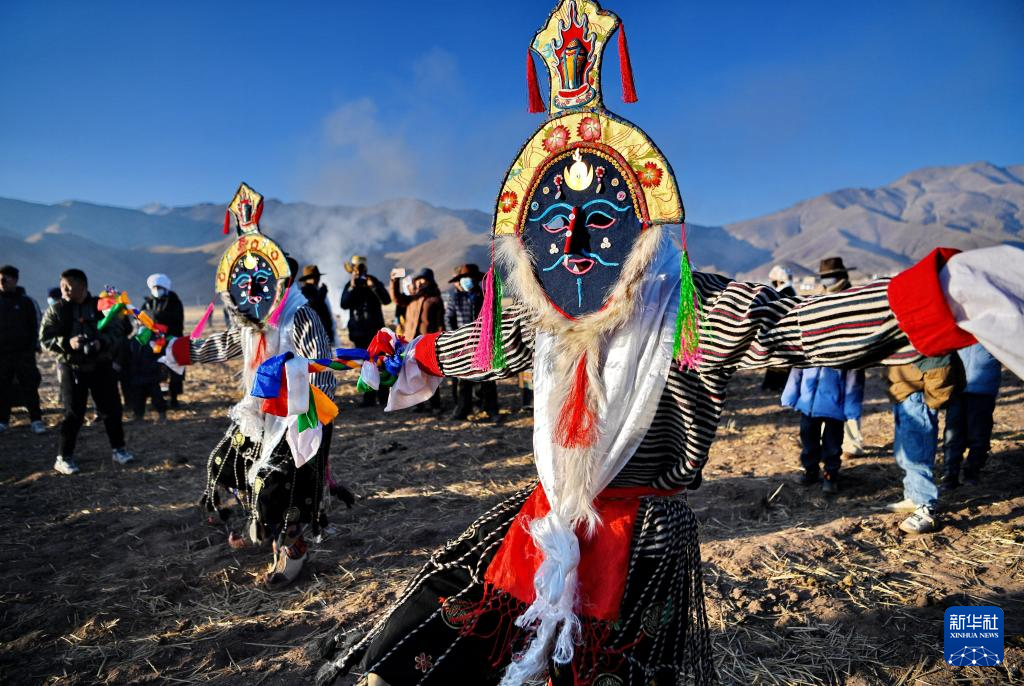 3月16日,在西藏拉萨市林周县春堆乡的春耕仪式现场,当地群众表演藏戏。