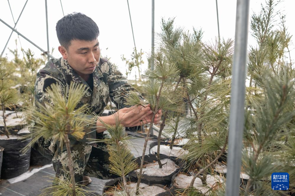 3月13日,在伊春森工集团林下经济种苗繁育基地,工作人员查看嫁接红松苗的生长情况。