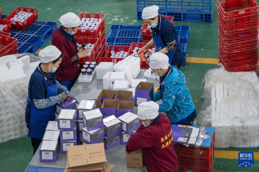 3月13日,在伊春市丰林县一家森林食品加工企业,工作人员在包装蓝莓相关产品。