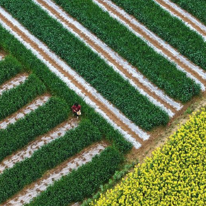 3月17日,在四川省阆中市白溪村,村民在给麦田里套栽的玉米苗施肥(无人机照片)。