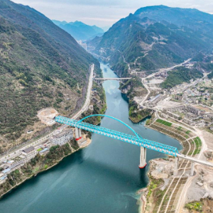 清水坪乌江特大桥位于武陵山区腹地的重庆市彭水苗族土家族自治县境内,是渝湘高铁重庆至黔江段“六隧五桥”之一和全线重难点工程。大桥全长804.6米,主跨240米,一跨过江,为国内首座双Y型单拱肋主拱结构无砟轨道高速铁路桥梁。该项目于2020年开工建设,目前已完成建设进度90%,进入最后收尾阶段。