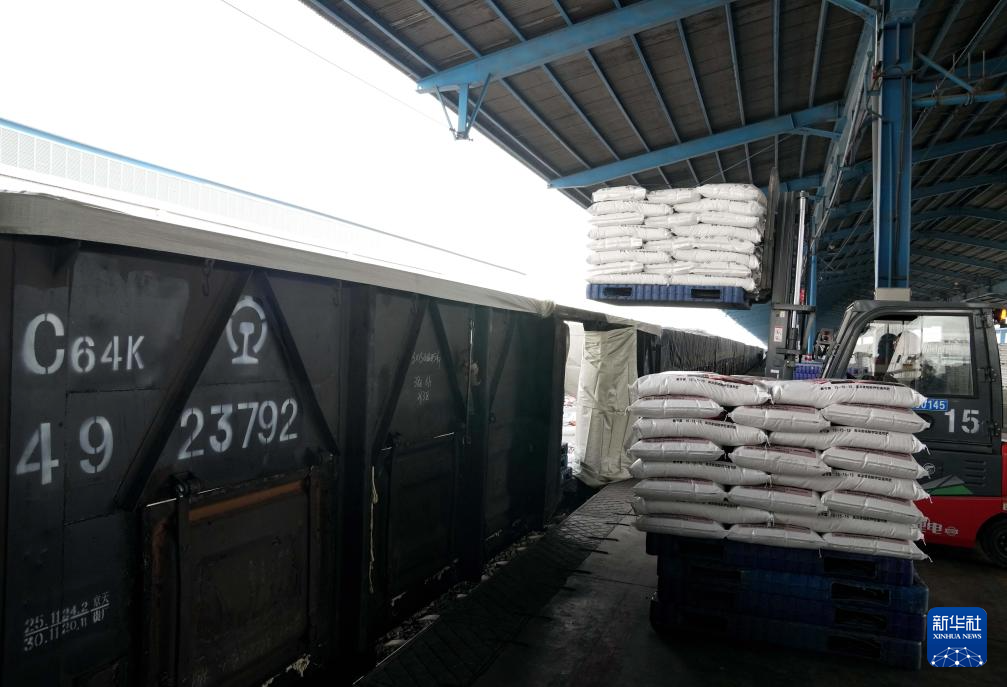 3月18日,工人在河北省秦皇岛市海港区一家化肥生产企业的列车站台操作叉车搬运化肥。