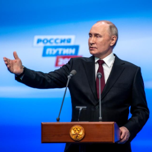 3月18日,普京在俄罗斯首都莫斯科的竞选总部回答记者提问。
