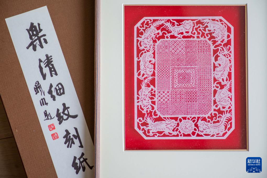 卢发良在工作室内展示自己的细纹刻纸作品“中国年”(3月12日摄)。