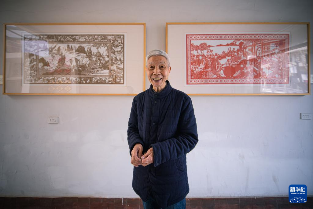 卢发良在工作室门口介绍自己以四大名著为主题创作的细纹刻纸作品(3月12日摄)。