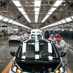 3月19日,奇瑞新能源汽车股份有限公司石家庄分公司的工人在总装车间生产线上工作。