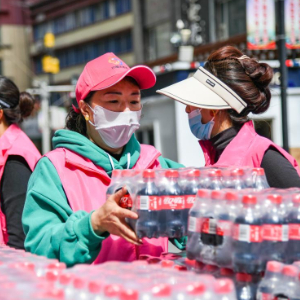 3月19日,在雅江县木雅广场,当地志愿者帮忙搬运物资。