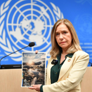 3月19日,在瑞士日内瓦,世界气象组织秘书长塞莱丝特·绍洛拿着《2023年全球气候状况报告》留影。