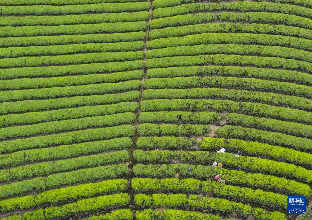 3月19日,茶农在重庆市永川区大安街道花果山村茶园采摘春茶(无人机照片)。