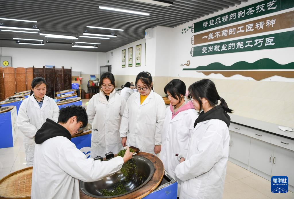 3月19日,全国技术能手、永川秀芽手工制作非遗传承人陈应会(右一)在向重庆市经贸中等专业学校茶叶生产与加工专业的学生演示手工制茶技艺。