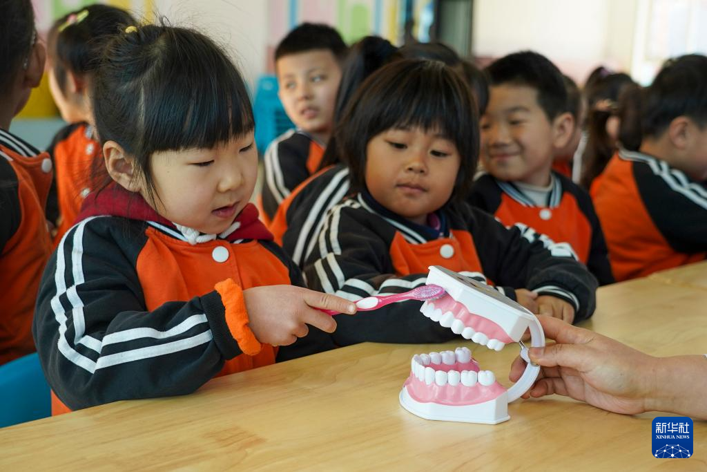 3月20日,河北省唐山市丰南区一幼儿园的小朋友在医生的指导下学习正确的刷牙方式。