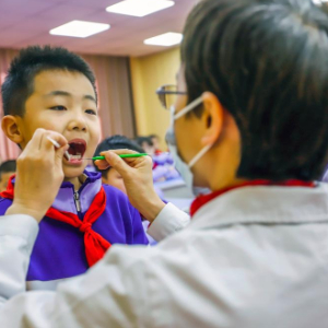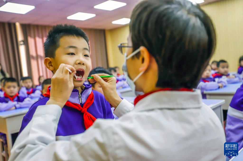 3月20日,河北省邢台市广宗县妇幼中心医护人员在给学生做口腔检查。