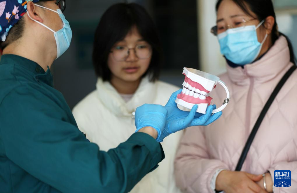 3月20日,在山东省临沂市郯城县郯城街道卫生院口腔科,医生给居民讲解口腔健康知识。