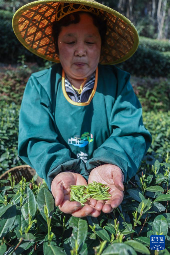 3月20日,梅家坞村的茶农展示刚刚采摘的西湖龙井鲜叶。