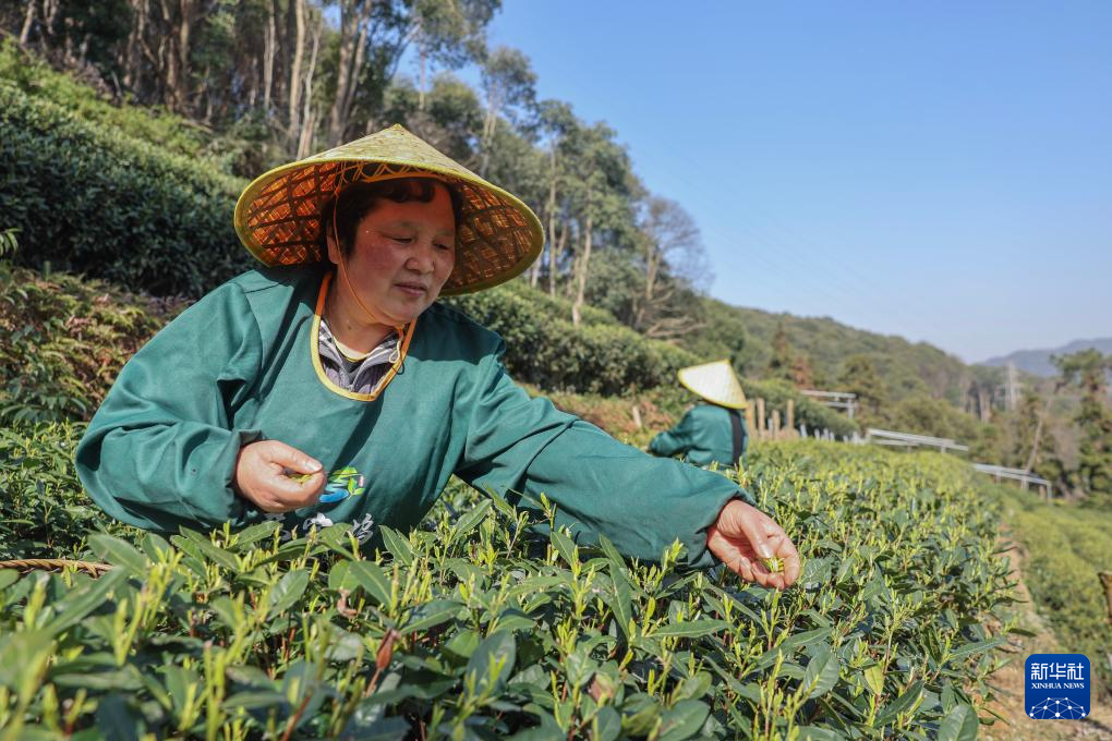 3月20日,梅家坞村的茶农在茶山上采摘西湖龙井“明前茶”。