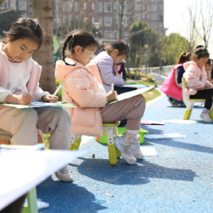 3月20日,在江阴市新桥镇康定社区,孩子们在户外观景写生。