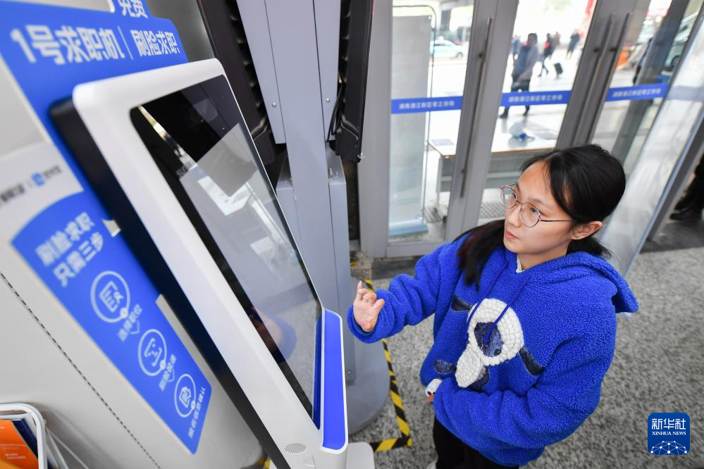 3月20日,在湖南湘江新区零工市场,求职者在求职机上查看岗位信息。