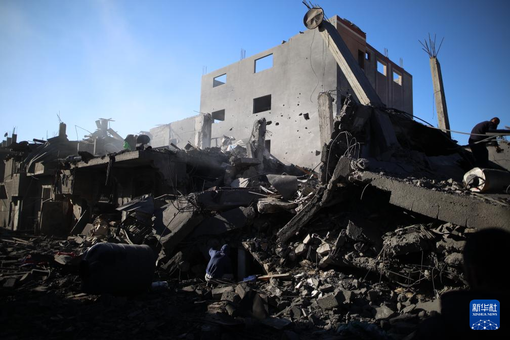 3月20日,在加沙地带中部努赛赖特难民营,人们查看以军空袭后的建筑废墟。