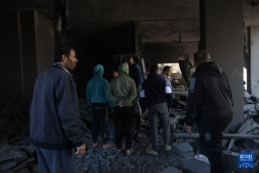 3月20日,在加沙地带中部努赛赖特难民营,人们查看以军空袭后的建筑。