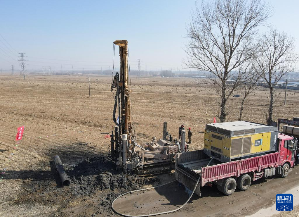 这是阜新蒙古族自治县王府镇哈拉哈村的农田灌溉水源井工程施工现场(3月21日摄,无人机照片)。