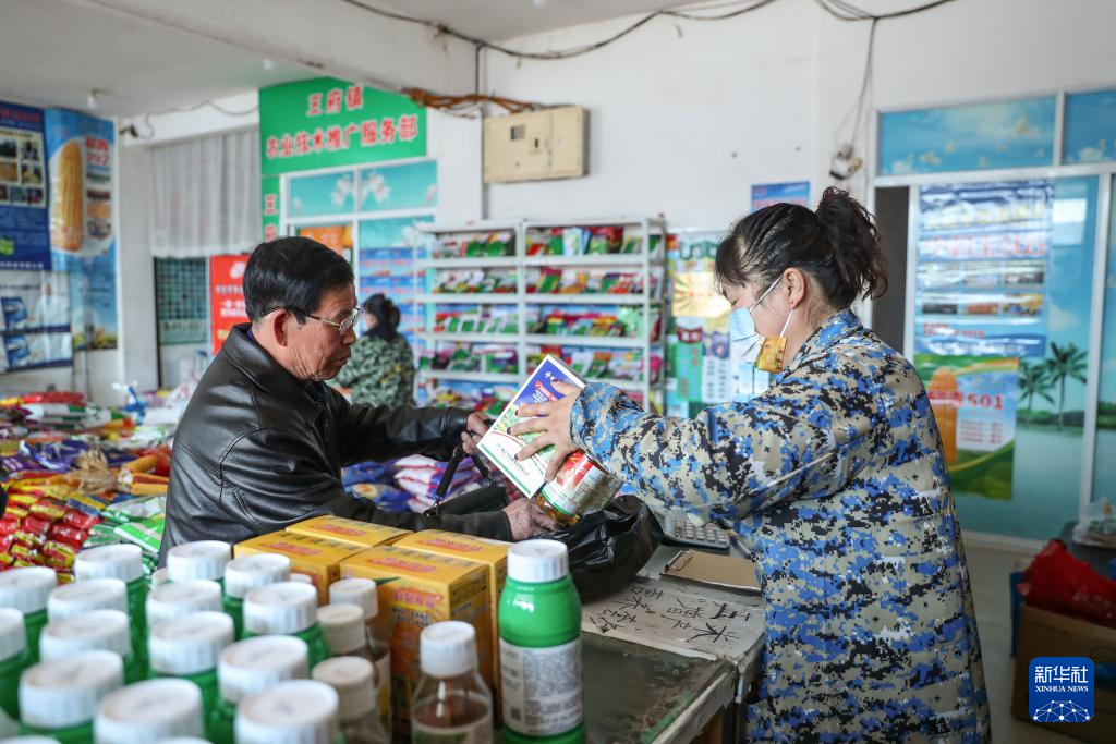 3月21日,在阜新蒙古族自治县王府镇,农户在一家农资商店购买除草剂。