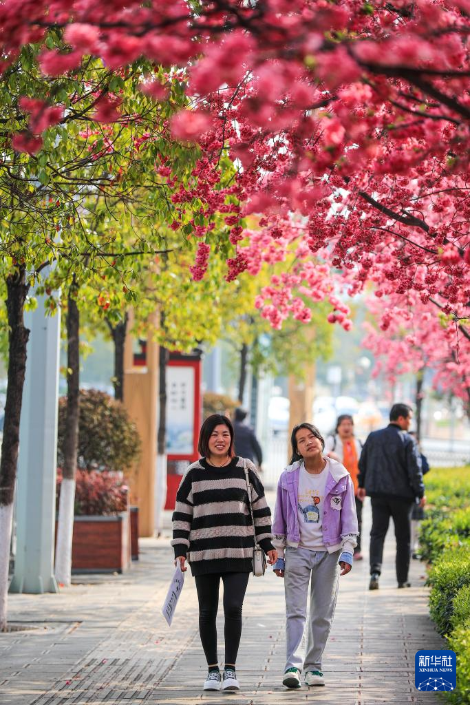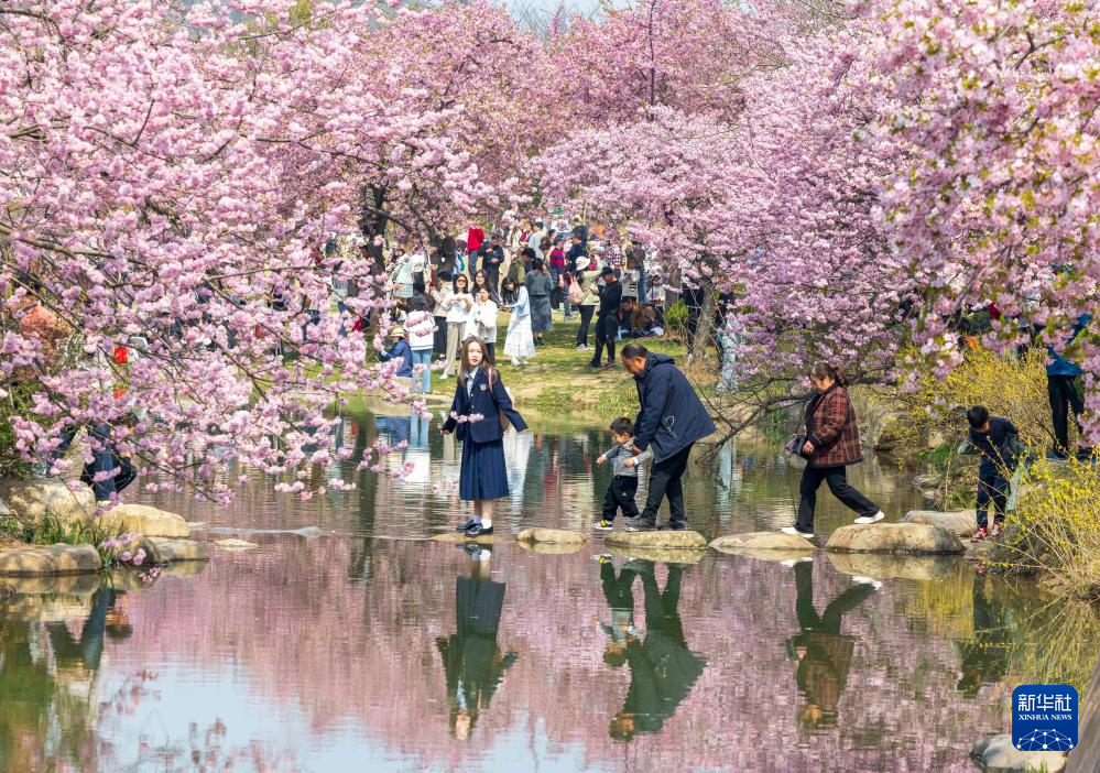 3月15日,游客在云南省曲靖市沾益区玉林广场樱花园赏樱游览。