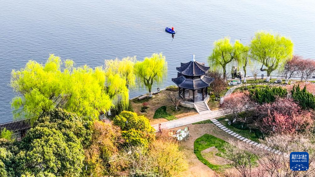 3月19日拍摄的江苏省南京莫愁湖景区春日晨景(无人机照片)。