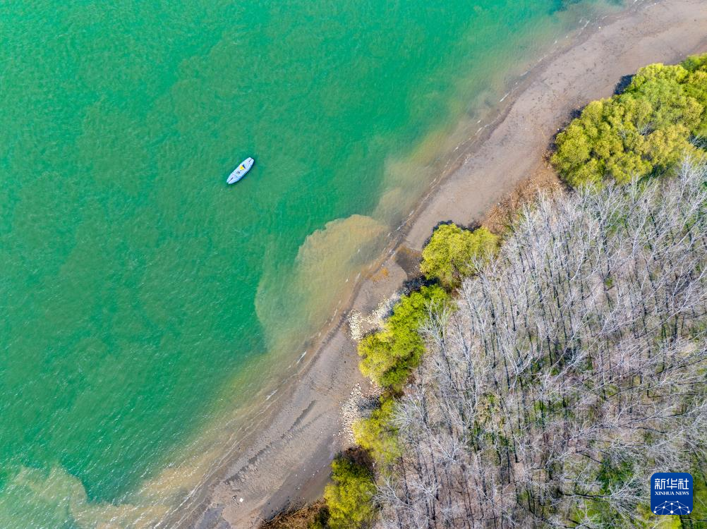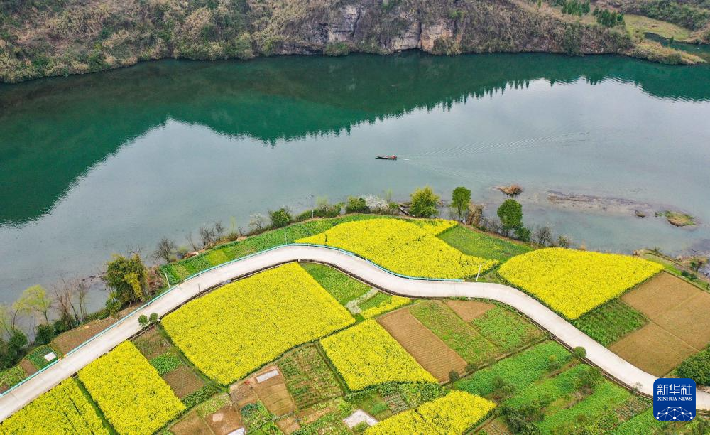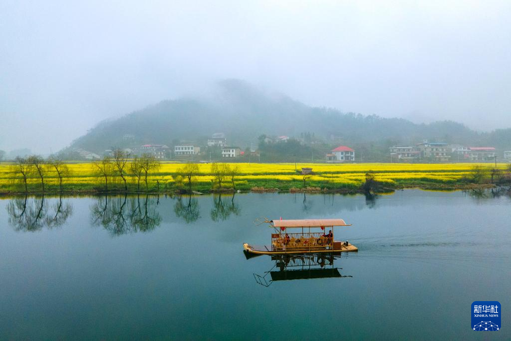 3月17日,在湖南省娄底市双峰县梓门桥镇街埠头村,游客乘船在侧水河上游玩(无人机照片)。