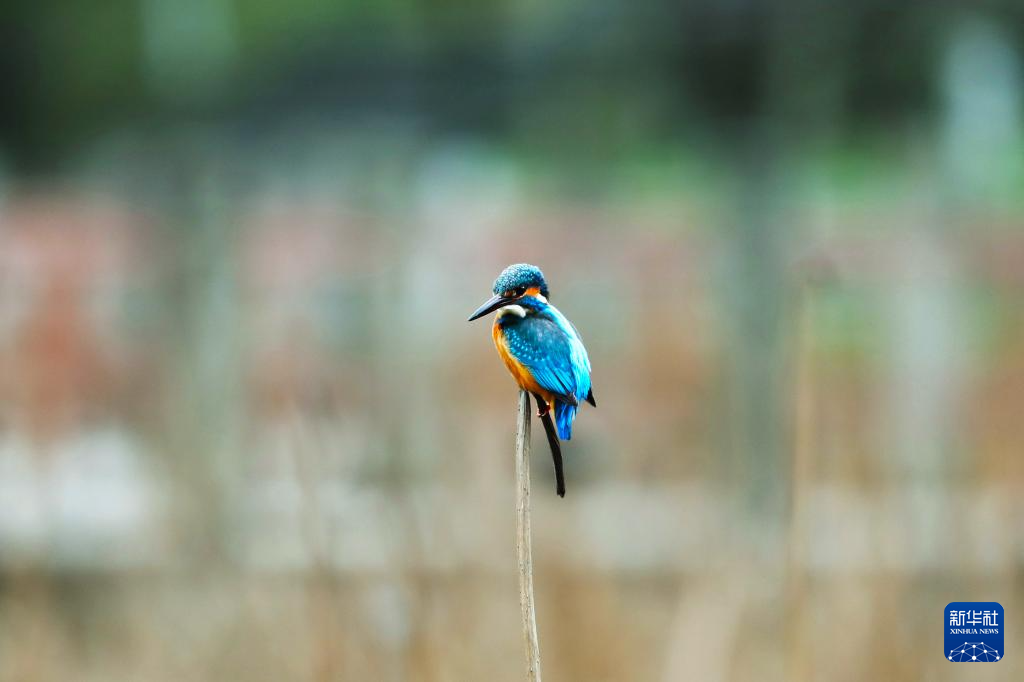 3月17日,四川省达州市通川区,一只翠鸟在荷塘停留。