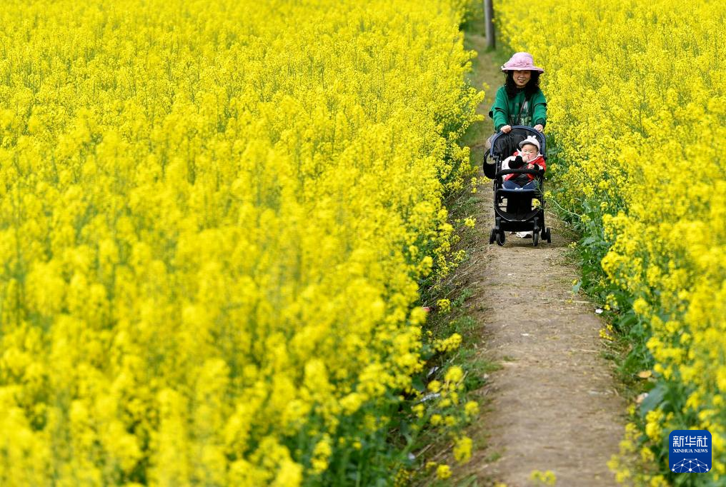 3月19日,在四川省广安市广安区花桥镇花桥村,游人在油菜花间游玩赏景。