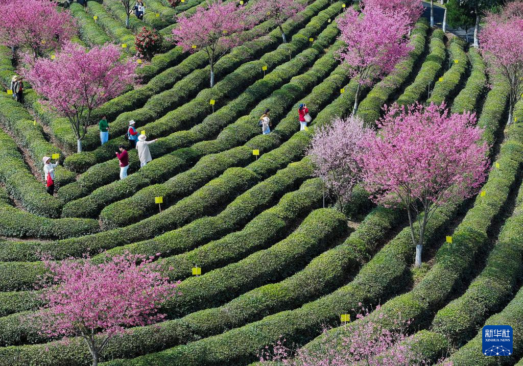3月19日,在安徽省黄山市徽州区谢裕大茶博园,游客在欣赏樱花茶园春景(无人机照片) 。