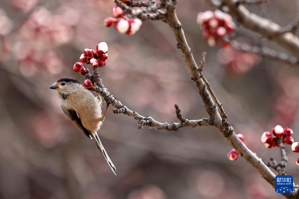 3月16日,在山东省枣庄市东湖公园,一只小鸟在杏花枝头上觅食。