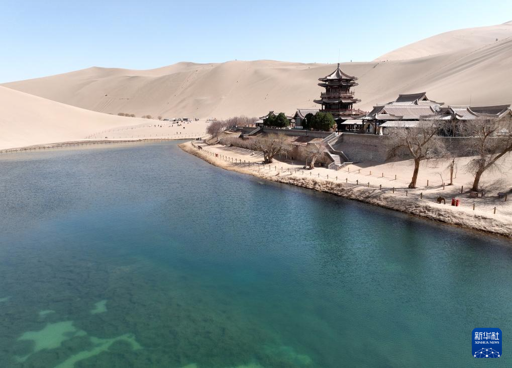 甘肃敦煌月牙泉碧波荡漾(3月18日摄,无人机照片)。