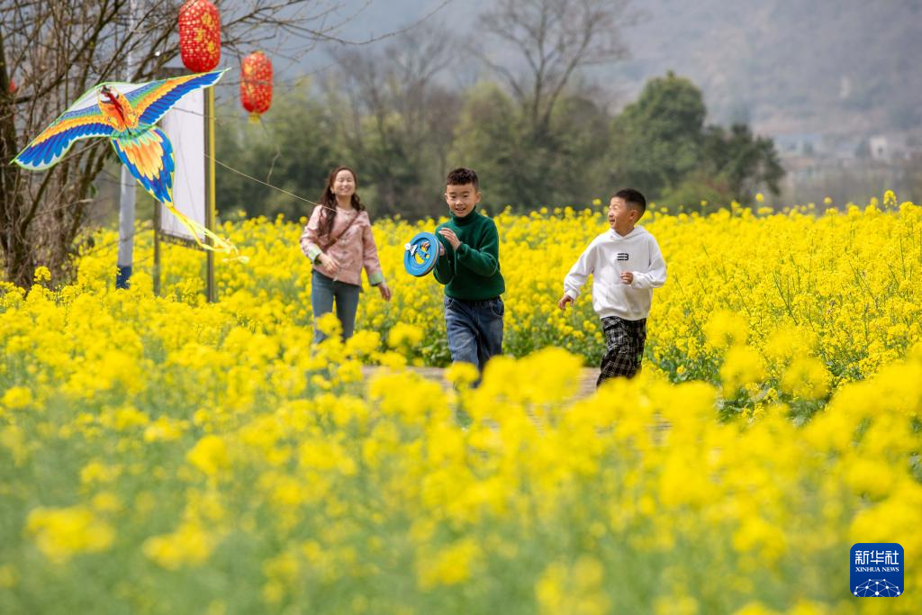 3月16日,小朋友在贵州省安顺市西秀区大西桥镇鲍家屯村油菜花田间放风筝。
