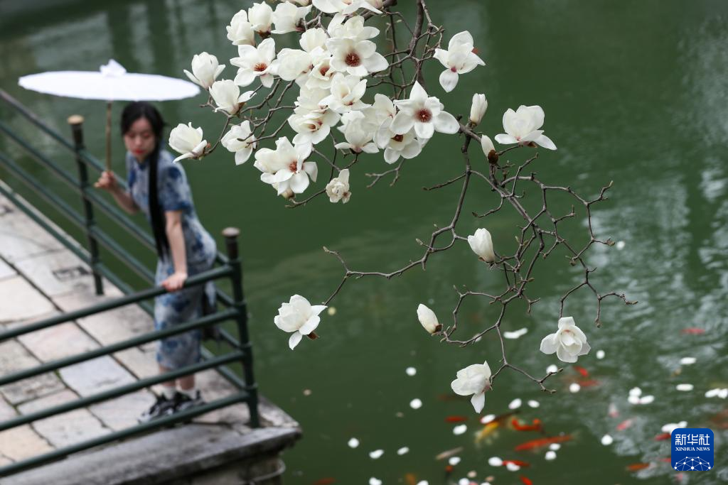 3月17日,游客在江苏扬州何园景区赏花拍照。