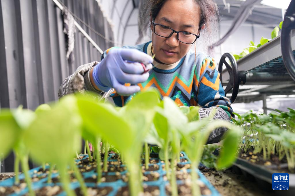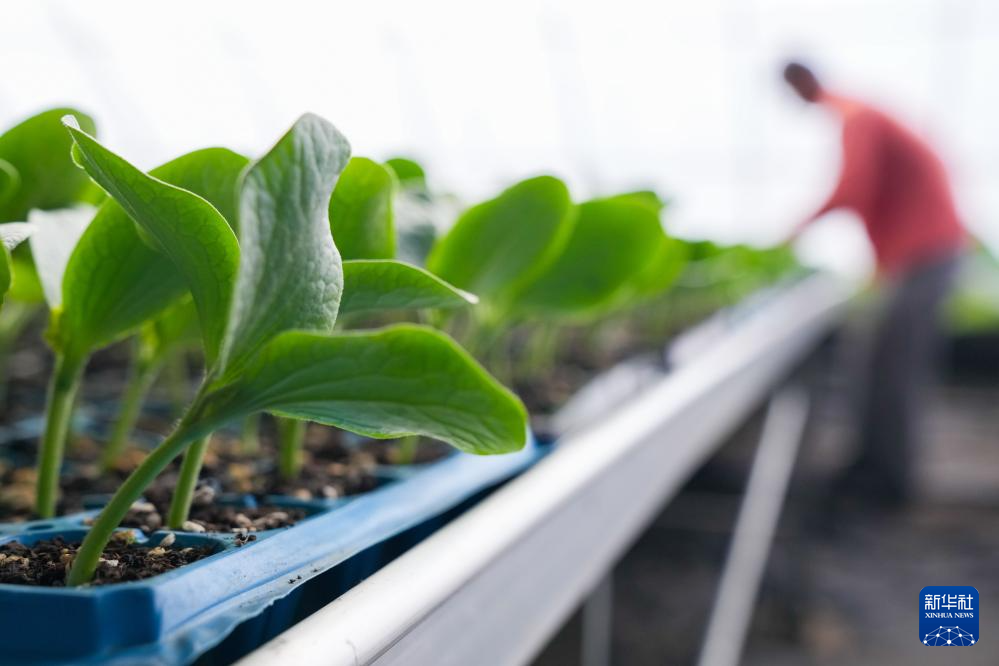 3月20日,工作人员在宁安农场乡村振兴产业园育苗工厂示范基地的温室内查看砧木长势。