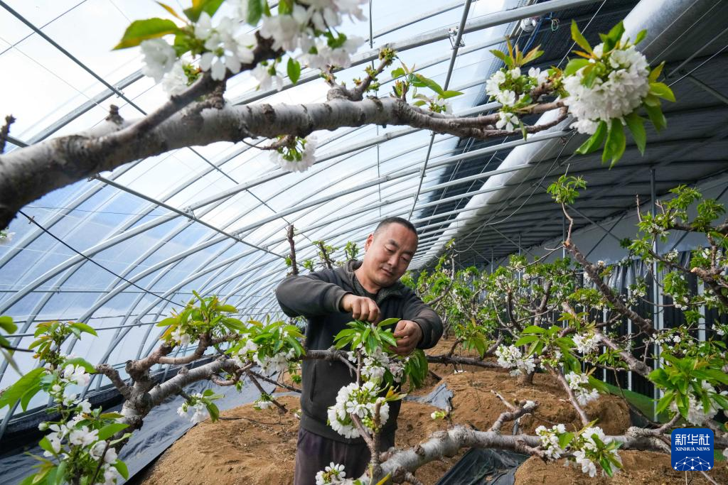3月20日,工作人员在兰岗镇自兴村采摘园的温室内查看樱桃树长势。